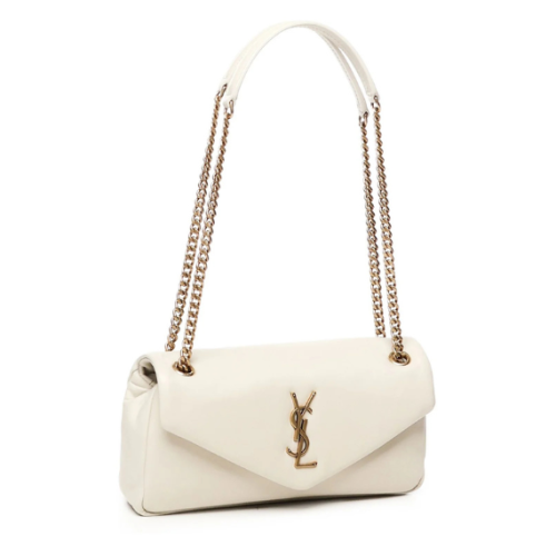 לוגו: לוחית מתכתית בגוון זהב עם מונוגרמת YSL בחזית התיק