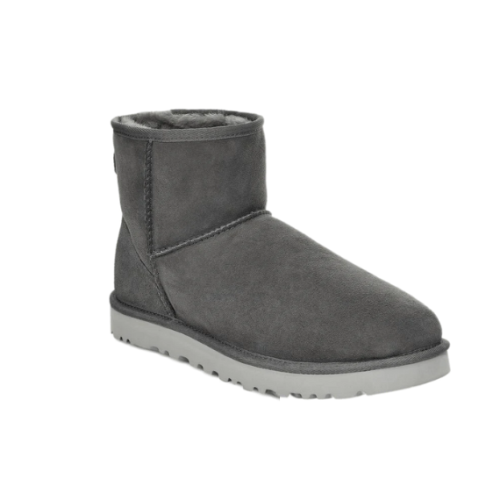 מגפי UGG מדגם Classic Mini II, עשויים זמש איכותי בגוון אפור ניטרלי ומתוחכם. כוללים בטנת צמר טבעי לנוחות ולשמירה על חום, עם סוליה עמידה ואחיזה מצוינת. הבחירה המושלמת למראה חורפי נוח וקלאסי