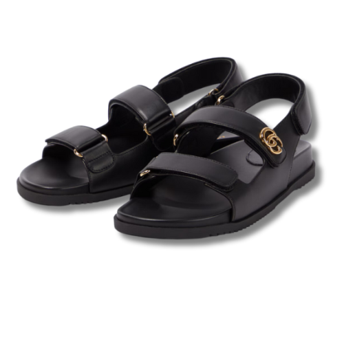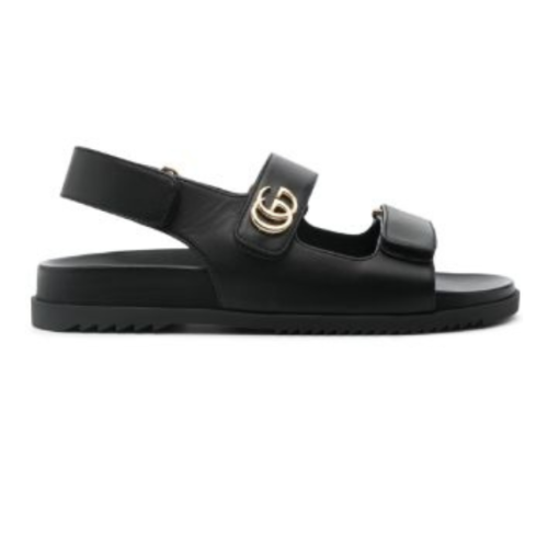 סנדלי עור יוקרתיים מבית גוצ'י, בעיצוב מעודן עם דוגמת GG מובלטת וסמל גוצ'י האייקוני. עשויים מחומרים איכותיים לנוחות ועמידות מרבית. מושלמים לשימוש יומיומי בקיץ וליצירת מראה אלגנטי ואופנתי